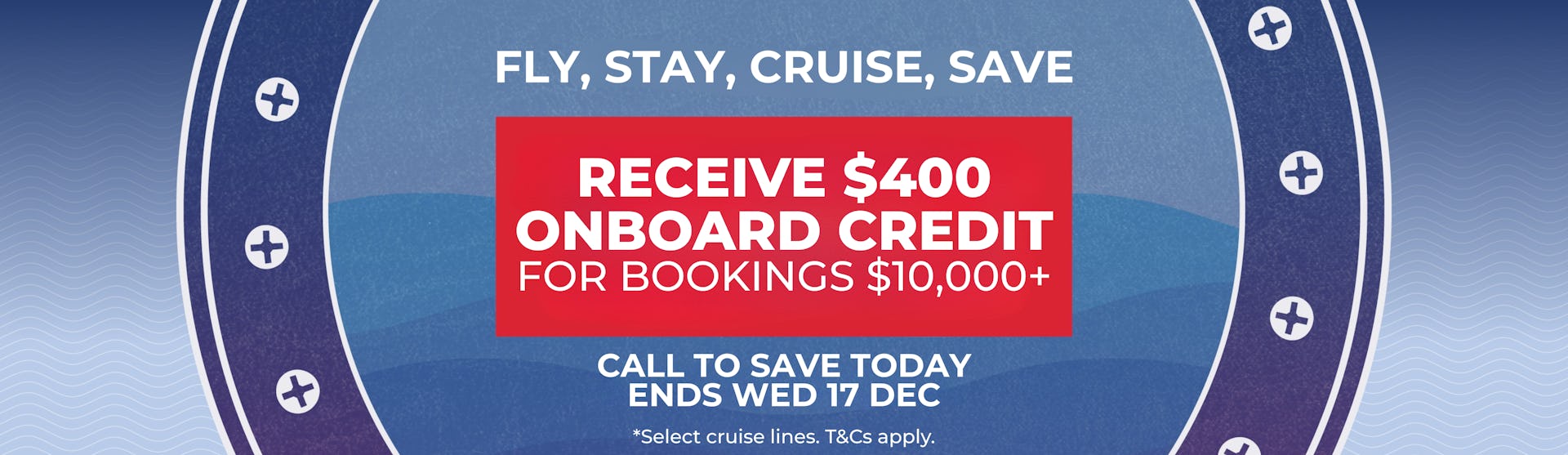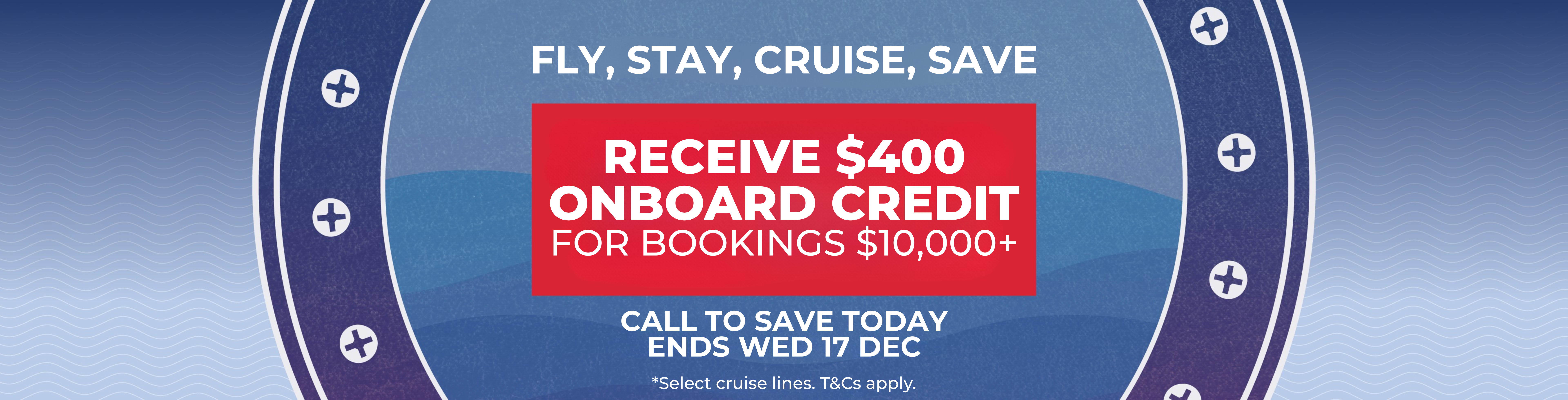 Enjoy the ultimate escape with a Fly Stay Cruise package. For a limited time, returned Inspiring Vacations customers receive $400 off in onboard credit per cabin when spending over $10,000 per booking with some of our favourite Fly, Stay, Cruise partners: