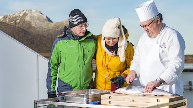 Embark on a culinary adventure alongside your scenic journey with Hurtigruten's Norway's Coastal Kitchen. Savour the freshest, most authentic flavours of Norway as chefs prepare exquisite dishes using local, seasonal ingredients sourced directly from the ports you visit. From melt-in-your-mouth cod sourced from Vesterålen to award-winning cheeses from Lofoten, every meal is a celebration of Norwegian culinary heritage. Enjoy the bounty of the sea, sample delicious regional specialties, and indulge in fresh, homegrown produce. Norway's Coastal Kitchen offers a unique opportunity to experience the true taste of Norway, complementing your exploration with a delightful gastronomic adventure.