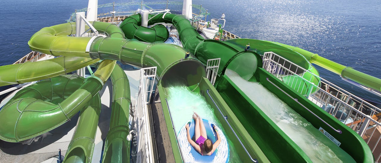 The pool deck is designed in two areas with pools among the largest at sea.